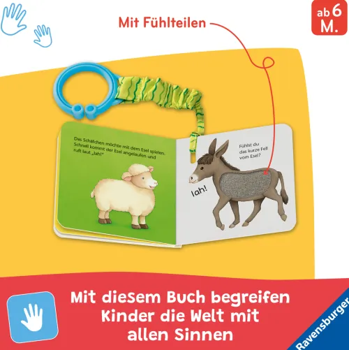 Esel, Kaninchen und Hund: in diesem Spielbuch können Kinder ab 6 Monaten ihre Lieblingstiere streicheln und anfassen. Die kurzen Texte und die Fühlteile animieren dabei zum aktiven Mitmachen.
