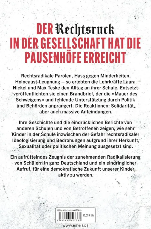 Rassismus, Hetze, Gewalt gegen »linke Zecken«, Homosexuelle und Migranten, offene Holocaust-Leugnung – so erlebten die Lehrkräfte Laura Nickel und Max Teske den Alltag an ihrer Schule. Entsetzt und zum Handeln entschlossen veröffentlichten sie einen Brandbrief, in dem sie »eine Mauer des Schweigens« anprangerten sowie die fehlende Unterstützung für Schulen durch Ämter, Politik und Eltern. Nach der Veröffentlichung erlebten die beiden Solidarität und Lob, aber auch heftige Anfeindungen. Ihre Geschichte, ihre Erfahrungen und die eindrücklichen Berichte von anderen Lehrern und Schülern zeigen, wie sehr Kinder in der Schule inzwischen der Gefahr rechtsradikaler Ideologisierung und Bedrohungen aufgrund ihrer Herkunft, Sexualität oder ihrer politischen Meinung ausgesetzt sind. Ein immer noch unterschätztes, brandaktuelles Problem, das Schulen in ganz Deutschland betrifft. Dieses Buch rüttelt auf und ermutigt zugleich, aktiv zu werden und die Lebenswelt für unsere Kinder so zu gestalten, dass sie auch zukünftig Demokratie leben können.