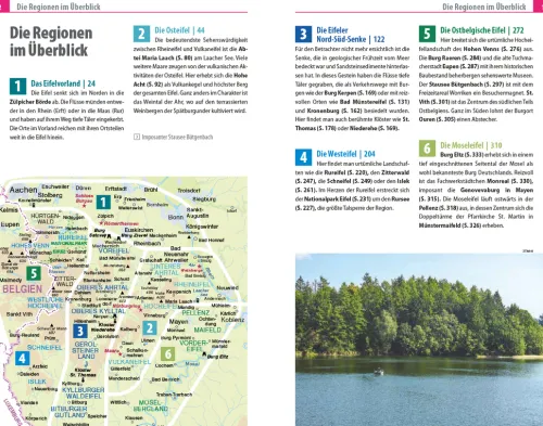 – Übersichtsseiten mit Beschreibungen aller Regionen: das Eifelvorland, die Osteifel, die Eifeler Nord-Süd-Senke, die Westeifel, die ostbelgische Eifel, die Moseleifel