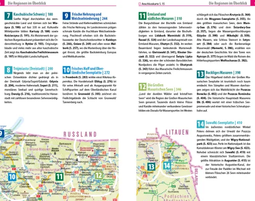 – Übersichtsseiten mit Beschreibungen aller interessanten Orte im Norden Polens: von der Hafenstadt Stettin über das geschichtsträchtige Trójmiasto und die einzigartige Insel Wolin bis zu den beeindruckenden Masurischen Seenlandschaften, der grünen Kaschubischen Schweiz und anderen Geheimtipps wie Ermland, Frischer Nehrung und der idyllischen Suwalki-Region