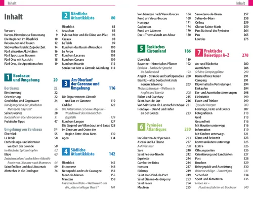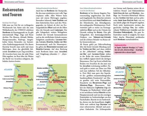 – Übersichtsseiten mit Beschreibungen aller Regionen: Bordeaux, Nördliche Atlantikküste, Oberlauf der Garonne, Südliche Atlantikküste, Baskisches Küstenland, Pyrénées Atlantiques