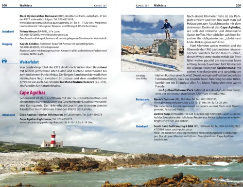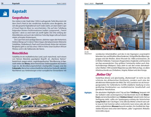 Die Vielfalt der einheimischen Kultur wie auch der Tierwelt ist geradezu überwältigend. Die aufregende Mischung aus zerklüfteten Bergen, schönem Wetter, hilfsbereiten Menschen sowie guter Infrastruktur macht das Kap zu einem idealen Reiseziel. Neben den Routenempfehlungen finden sich in diesem Südafrika-Reiseführer zahlreiche Geheimtipps für Genuss, Abenteuer und Entspannung – vom Wine Tasting in den Winelands über Trommel-Workshops in Kapstadt bis zur Bootstour zu den Jagdgründen des Weißen Hais.