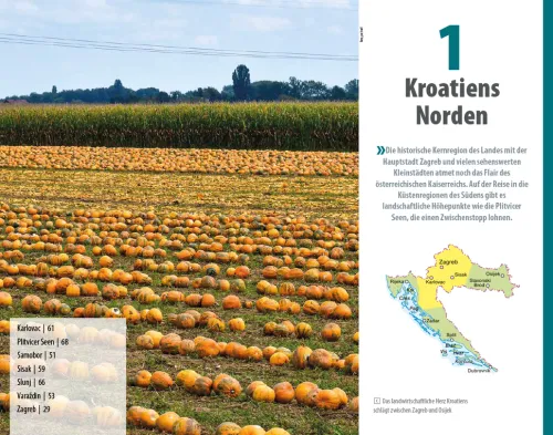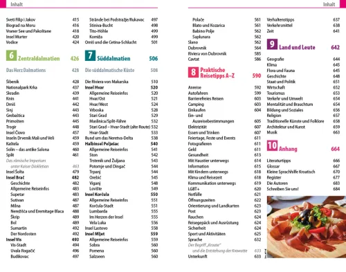 – Übersichtsseiten mit den bedeutendsten Regionen im Überblick: Kroatiens Norden, Slawonien, Istrien, Kvarner Bucht, Norddalmatien, Zentraldalmatien und Süddalmatien