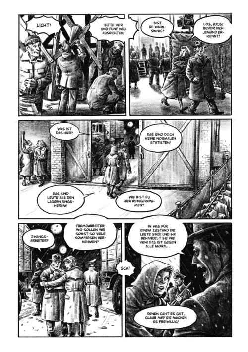 Berlin, Spätsommer 1944: Heinz Hoffmann lebt seit elf Jahren als »verbotener Autor« in der inneren Emigration, als ein Luftangriff seine Wohnung zerstört und er Zuflucht bei seiner ehemaligen Geliebten Erika Harms suchen muss. Die UFA-Mitarbeiterin bringt ihn ins Spiel, als händeringend ein Ghostwriter für das Drehbuch eines vom NS-Propagandaministerium dringlichst angeforderten »Durchhaltefilms« gesucht wird. Durch Widrigkeiten und staatliche Repressalien mürbe geworden, lässt Heinz sich schließlich darauf ein. . . Als die Filmproduktion dauerhafter Bombardierungen wegen von Babelsberg aufs Land verlegtwird, finden sich auch Heinz und Erika unter denGlücklichen, die mitreisen dürfen. Und während in ihrem Potemkinschen Dorf bald niemand mehr weiß, ob ihr Tun angesichts der auch hier nahenden Alliierten noch zielführend ist, ringt Heinz Hoffmann mit seinem Gewissen: Wie sehr ist er um des Überlebens willen ein Teil des national-sozialistischen Systems geworden? Mitreißend und in grandios-atmosphärischen Zeichnungen erzählt e. o. plauen-Preisträgerin Isabel Kreitz angelehnt an die Biografien Erich Kästners und weiterer Kulturschaffender eine Geschichte über Künstler:innen in der Diktatur, innere Emigration und den letzten Film des »Dritten Reichs«.