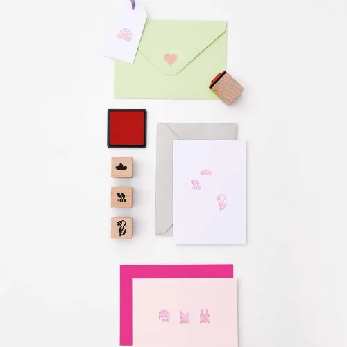 Die Themenwelt Futschikato begeistert mit modernen Pixeldesigns. Gestalten Sie mit dem Stempelset individuelle Grußkarten, Einladungs- und Tischkarten oder Geschenkanhänger. Die Stempel zeigen verschiedene, süße Pixel-Motive, die der Kreativität freien Lauf lassen. Das Set enthält zwölf Holzstempel und ein Stempelkissen in Neon Pink. – Stempelset mit coolen Pixel-Motiven – 12 Stempel inklusive Stempelkissen (Neon Pink) – Größe: 4x16cm – Design: Futschikato 12 Stempel, 1 Tuschestempelkisssen neon pink.