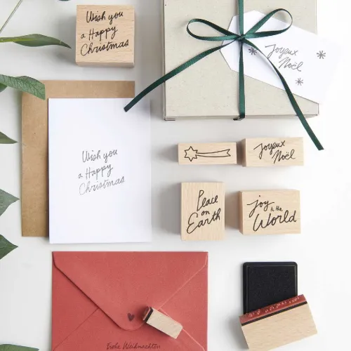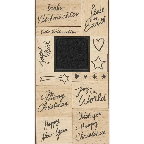 Das Stempelset umfasst Stempel mit weihnachtlichen Schriftzügen und cleanen Motiven. So lassen sich individuelle Grußkarten, Einladungs- und Tischkarten oder Geschenkanhänger hervorragend gestalten. Die Stempel zeigen weihnachtliche Schriftzüge und passende schlichte Motive. Das Set enthält 15 Holzstempel in verschiedenen Größen, sowie ein schwarzes Stempelkissen. Inhalt: FSC 100%, 15 Stempel. Maße: 30 x 80 x 160 mm.
