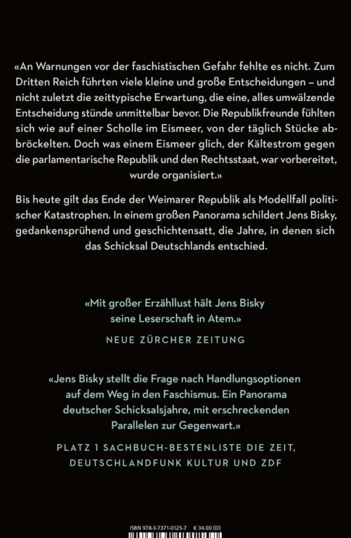 Platz 1 der Sachbuch-Bestenliste von Die Zeit, Deutschlandfunk und ZDF: „Jens Bisky stellt die Frage nach Handlungsoptionen auf dem Weg in den Faschismus. Ein Panorama deutscher Schicksalsjahre, mit erschreckenden Parallelen zur Gegenwart.“