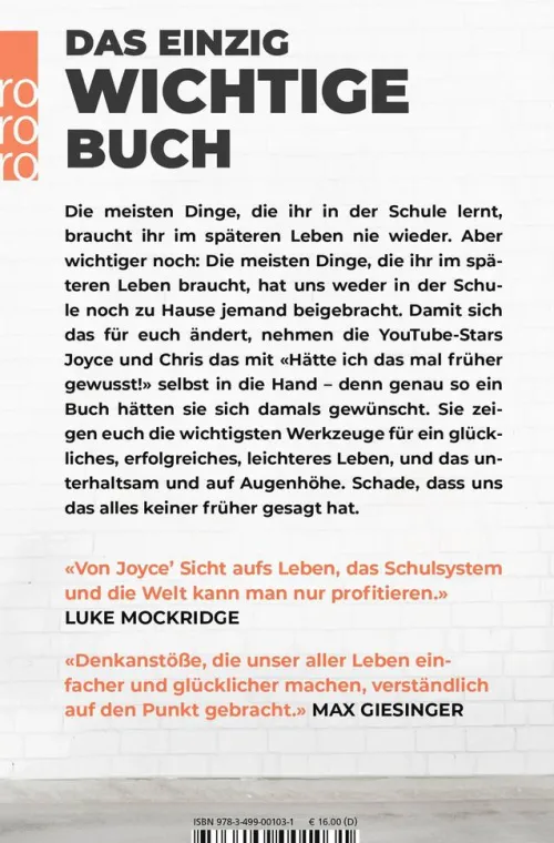 Die meisten Dinge, die ihr in der Schule lernt, braucht ihr im späteren Leben nie wieder. Aber wichtiger noch: Die meisten Dinge, die ihr im späteren Leben braucht, hat uns weder in der Schule noch zu Hause jemand beigebracht. Damit sich das für euch ändert, nehmen die YouTube-Stars Joyce und Chris das mit «Hätte ich das mal früher gewusst» selbst in die Hand – denn genau so ein Buch hätten sie sich damals gewünscht. Sie zeigen euch die wichtigsten Werkzeuge für ein glückliches, erfolgreiches, leichteres Leben, und das unterhaltsam und auf Augenhöhe. Schade, dass uns das alles keiner früher gesagt hat.