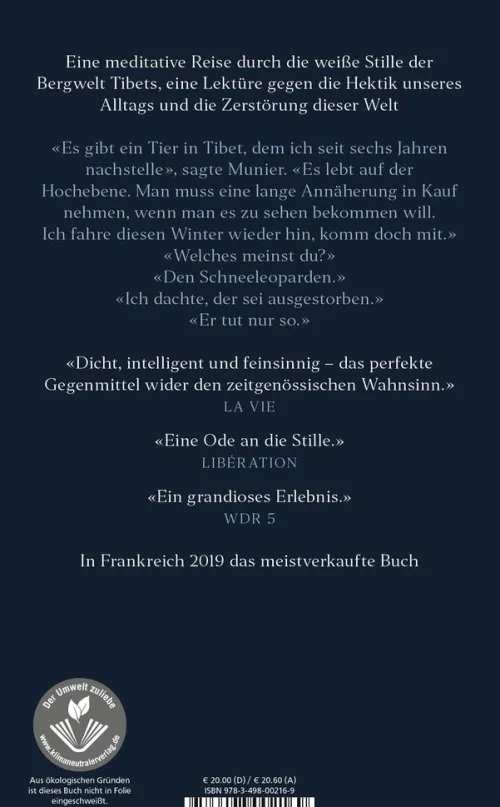 Auf über 4000 Metern, fernab vom Lärm der Zivilisation, hinterfragt Tesson eine Welt, in der kaum noch Raum bleibt für das Ungebändigte und die Entfaltung der Schönheit der Natur. Entstanden ist ein aufrüttelndes, preisgekröntes, kraftvolles Werk, dessen Sog man sich nicht entziehen kann: Eine meditative Reise in die weiße Stille des Himalaya, eine Lektüre gegen die Hektik unseres Alltags und die Zerstörung der Welt.