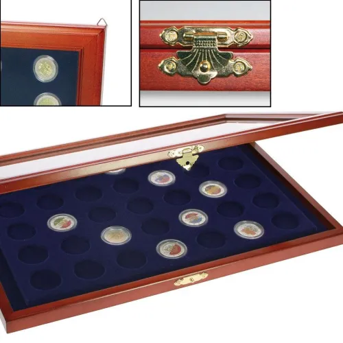 Diese Münzen-Vitrine ist in hochwertiger Holzausführung – der edle Rahmen für Ihre Münzsammlung. Der Holzrahmen oben hat einen Glaseinsatz. Die Vitrine ist innen mit einem königsblau beflockten Einsatz mit runden Vertiefungen versehen. Für bis zu 35 Stück 10 oder 20 Euro-Münzen (In diese Vitrine passen auch 35 Stück 2 Euro-Münzen in Kapseln). Schön ist auch das messingfarbene Klappschloss mit den soliden Beschlägen. Die Vitrine kann an der Wand befestigt werden, die Münzen bleiben in ihrer Position. Die Außen-Abmessung der Vitrine ist 375 x 260 x 30 mm.