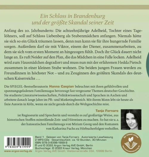 Tanja Fornaro ist Regisseurin und Sprecherin und versteht es auf großartige Weise, aus historischen Stoffen Zeit- und Hörreisen zu machen. So hat sie u. a. Romanen von Miriam Georg und Katharina Fuchs zu Hörbucherfolgen verholfen
