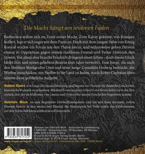 Gabriele Blum ist eine begnadete Hörbuchinterpretin und hat mit ihrer warmen, vollen Stimme bereits in den ersten drei Bänden die Ränkespiele bei Hofe sowie das Kräftemessen auf den Schlachtfeldern eindrucksvoll inszeniert.