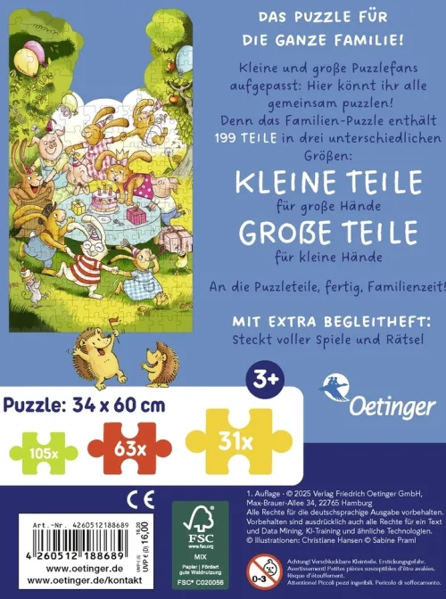 Bei den sieben kleinen Hasen herrscht meistens ein großes Durcheinander. Schafft ihr es, das Chaos zu ordnen? Es gibt große Puzzleteile für kleine Hände und kleine Puzzleteile für große Hände. So kann man die typisch wimmelige Szene der Hasenbande gemeinsam zusammensetzen: Während ich den Geburtstagstisch puzzle, machst du dich schon mal an die Wiese. Und am Ende setzen wir unsere Teile zusammen. Ein Spaß für die ganze Familie! Puzzleformat: 34 x 60 cm, 199 Teile (31x L | 63x M | 105x S)