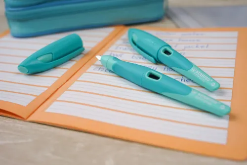 Eine spezielle Einfassung der Feder beugt blauen Fingern während des Schreibens vor. Der Austausch des gesamten Schreibeinsatzes inklusive Tintenleiter ermöglicht einen einfachen Federwechsel und Schreibperformance wie am ersten Tag. Erhältlich sind die beiden Feder-Varianten Standard (M) und Anfänger (A). Den super robusten Schulfüller gibt es in drei zarten Pastellfarben für Rechtshänder und zwei für Linkshänder. Damit es im Klassenzimmer zu keiner Verwechslung kommt, hat der STABILO EASYbirdy