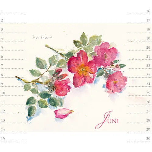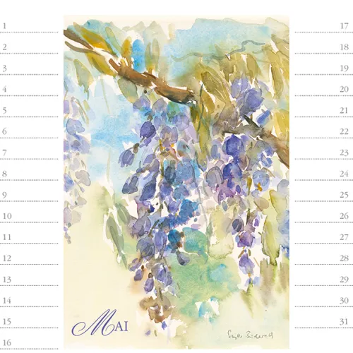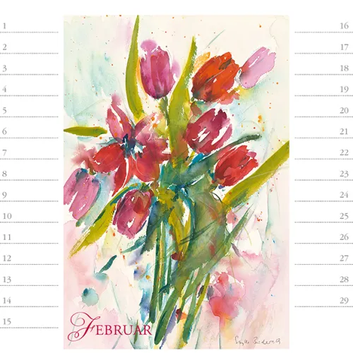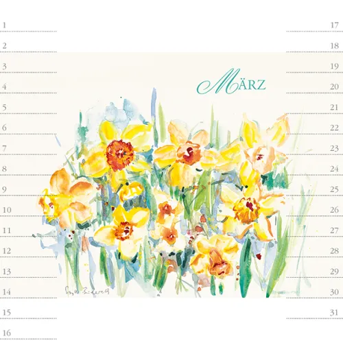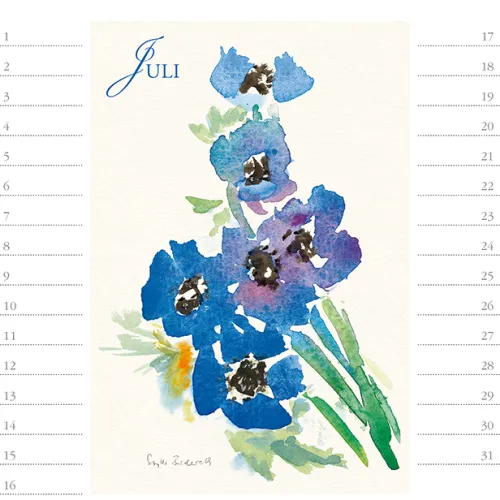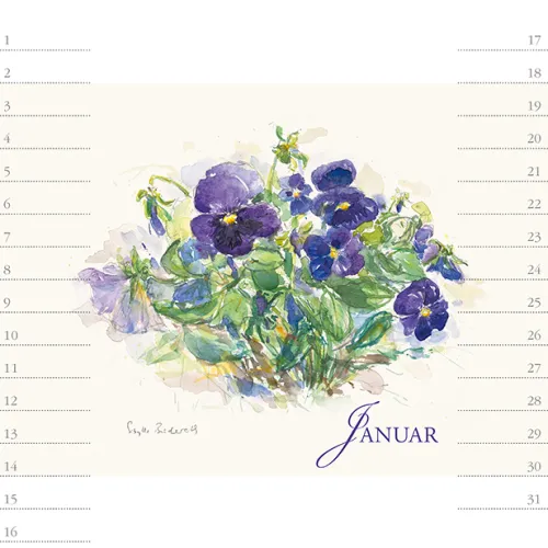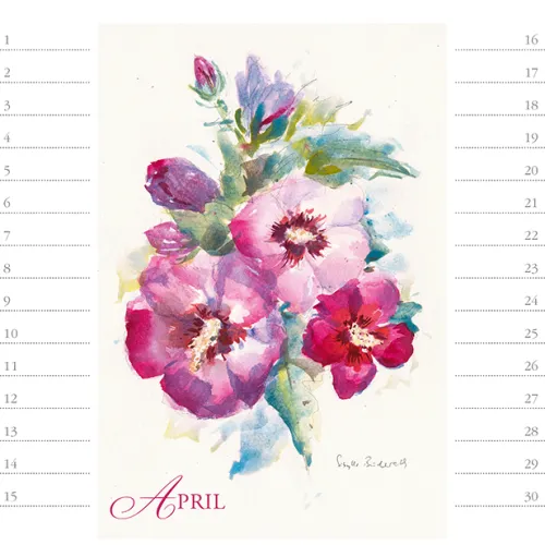 Die am Bodensee lebende Aquarellmalerin Sibylle Buderath ist bekannt für ihre detailgetreue und farbenprächtige Darstellung von Blumen. Jedes Monatsblatt zeigt im Wandel der Jahreszeiten die entsprechende Blüte.
