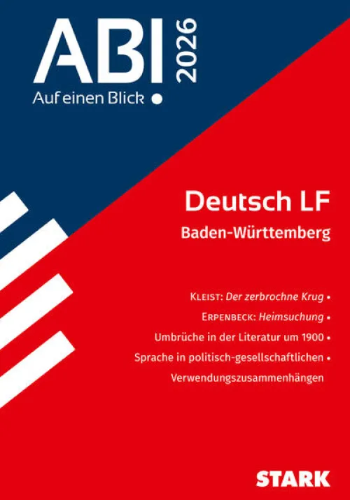 - Klar strukturierter Aufbau für das schnelle Erfassen der zentralen Aspekte aller im Abitur relevanten Schwerpunktthemen: H. v. Kleist, Der zerbrochne Krug; J. Erpenbeck, Heimsuchung; Umbrüche in der Literatur um 1900; Sprache in politisch-gesellschaftlichen Verwendungszusammenhängen.