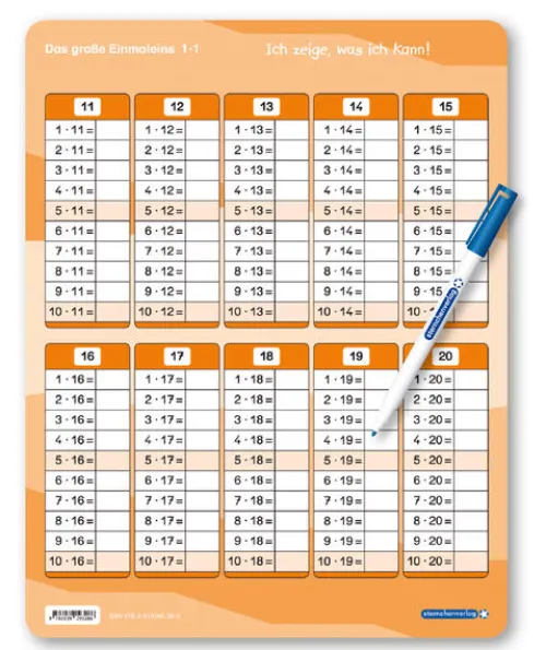 Das große 1×1 mit SpezialstiftJedes Kind kann auf der Rückseite die Felder ausfüllen und sich selbstgesteuert kontrollieren mit Hilfe der Vorderseite. Hier können die Malfolgen immer wieder geübt werden. Praktisch und stabil, prima geeignet für den täglichen Gebrauch im Unterricht. Trocken abwischbar ohne zu schmieren und ohne Farbrückstände. Karte: 32, 5 x 25 cm (Vorder- und Rückseite) mit Spezialstift – Made in GermanyAuch erhältlich: „Mein Hunderterfeld“ und „Das kleine Einmaleins“ mit StiftISBN: 978-3-939293-11-8