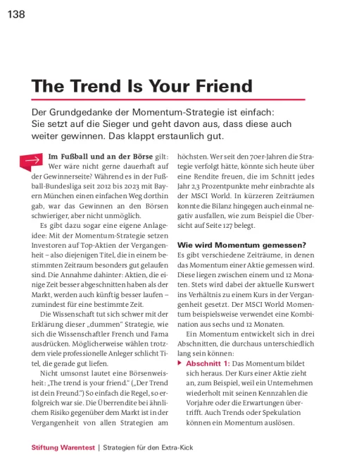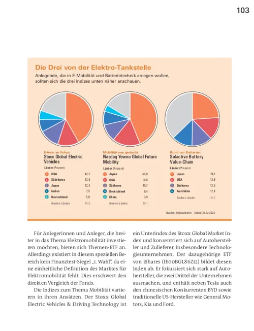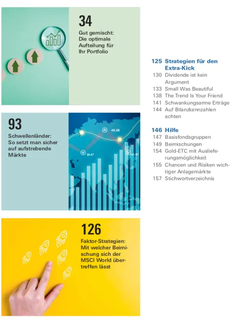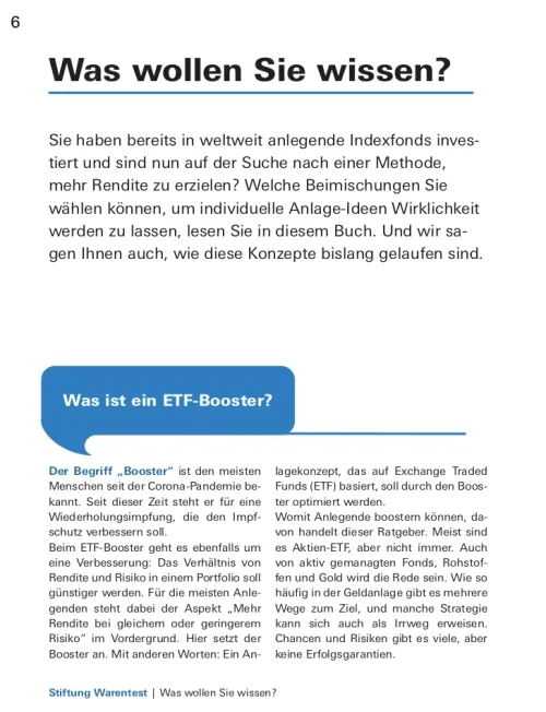 Lernen Sie in diesem Leitfaden zusätzlich die von den Expertinnen und Experten der Stiftung Warentest entwickelten Erweiterungen zum Basis-Portfolio kennen. Mit Spezial-ETF lassen sich eigene Anlageideen an der Börse einfach umsetzen und zusätzliche Renditechancen nutzen. Anleger können zum Beispiel gezielt auf Schwellenländer setzen oder spannende Megatrends im eigenen Portfolio abbilden. Lesen Sie im Buch außerdem, welche Möglichkeiten Branchen-, Themen-, Faktor-/Strategie- und Rohstoff-ETF bieten und wo die Chancen, Risiken und Besonderheiten der jeweiligen Indizes liegen.