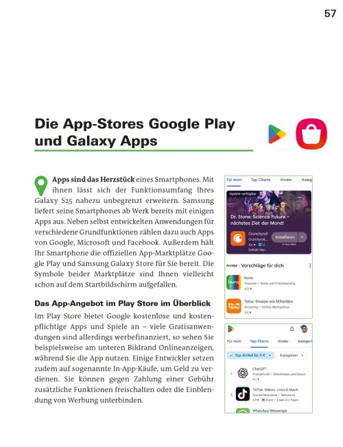 Sie lernen, wie Sie Apps aus dem Google Play Store und den Galaxy Apps sinnvoll nutzen, Widgets und Benachrichtigungen personalisieren oder Fotos und Videos mit der leistungsstarken Kamera aufnehmen. Erfahren Sie alles über die besten Einstellungen, den Umgang mit der Samsung Health App oder wie Sie Ihr Gerät vor Schadsoftware und Datenverlust schützen. Auch smarte Funktionen wie Sprachassistenten, VPN oder Samsung DeX werden verständlich erklärt.