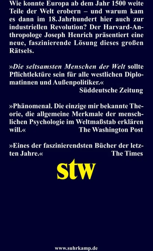 Es gibt einen Menschenschlag, der sich von anderen stark unterscheidet. Sein Gehirn ist so verdrahtet, dass er Gesichter schlechter erkennt, weniger auf Verwandte achtet und die Welt »scheibchenweise« verstehen will. Bei diesen sonderbaren Personen handelt es sich um »Westler«. Aber warum sind wir im »Westen« so sonderbar und was hat das mit Demokratie und Religion, Falschparken und Heiraten, Totems und Tabus, Aufklärung, industrieller Revolution, Globalisierung und fast allem anderen zu tun? Anhand von faszinierenden psychologischen Experimenten, ausgedehnten Feldforschungen und einer Fülle von Daten zeigt Joseph Henrich, wie uns Evolution, Geschichte und Kultur zu dem gemacht haben, was wir heute sind: die seltsamsten Menschen der Welt.