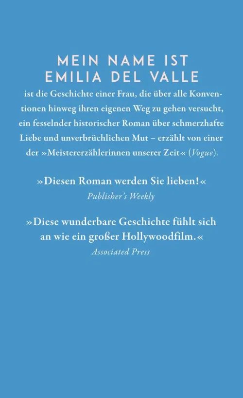 Mein Name ist Emilia del Valle ist die Geschichte einer Frau, die über alle Konventionen hinweg ihren eigenen Weg zu gehen versucht, ein fesselnder historischer Roman über schmerzhafte Liebe und unverbrüchlichen Mut – erzählt von einer der »Meistererzählerinnen unserer Zeit« (Vogue).