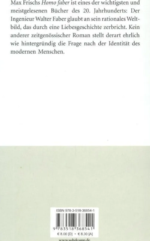 Max Frischs Homo faber ist eines der wichtigsten und meistgelesenen Bücher des 20. Jahrhunderts: Der Ingenieur Walter Faber glaubt an sein rationales Weltbild, das aber durch eine ‚Liebesgeschichte‘ nachhaltig zerbricht.