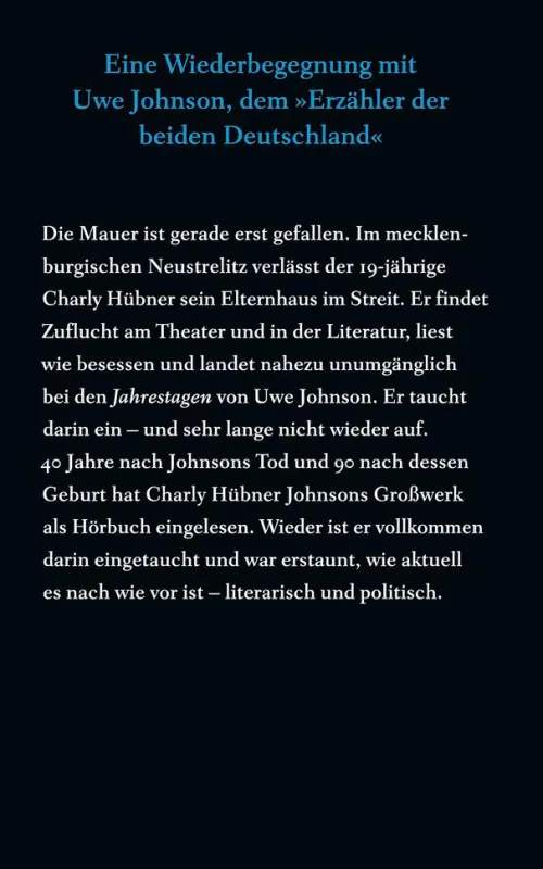 Die Mauer ist gerade erst gefallen. Im mecklenburgischen Neustrelitz verlässt der 19-jährige Charly Hübner sein Elternhaus im Streit. Er findet Zuflucht am Theater und in der Literatur, liest wie besessen und landet nahezu unumgänglich bei den Jahrestagen von Uwe Johnson. Er taucht darin ein – und sehr lange nicht wieder auf.