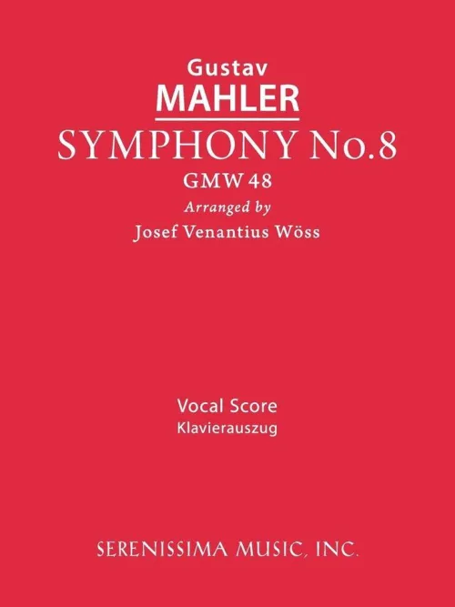 Mahler’s penultimate symphony received its premiere performance in Munich on September 12th, 1910 with a chorus of about 850, and an orchestra of 171. These massive forces led to Mahler’s agent dubbing the work „Symphony of a Thousand.“ Mahler did not approve of the title at all, but it remains. The piece was a great success at its premiere, one of few of Mahler’s works to be well received in his lifetime. It was the last premiere of one his works that Mahler witnessed before his death. Unabridged digitally enhanced reprint of the vocal score prepared by Josef Woss that was first published in 1910 by Universal Edition, Vienna. Matching large conductor score and complete orchestral parts are also available from Serenissima Music (96070).