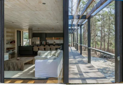 Die Casa de la Encina von Aranguren + Gallegos, ein eleganter, offener und klar strukturierter Betonbau liegt, eingerahmt von Pinien, am südlichen Hang des Monte Abantos nördlich von Madrid und erinnert an einen modernen, großen Aussichtspavillon. Die untere Ebene, in der sich die Schlafräume befinden, ist in Fels eingebettet und bietet wie die obere, in die eine auf dem Baugrund vorgefundene Steineiche integriert wurde, mit Panoramafenstern und Veranden einen fantastischen Ausblick auf die Ebene, die sich von der Sierra de Guadarrama bis Madrid erstreckt.