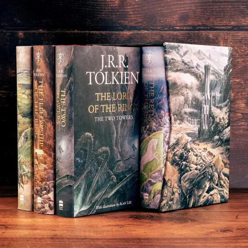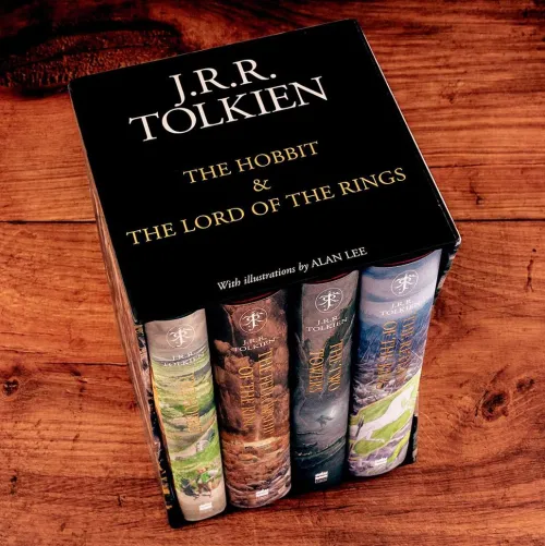 A boxed set containing the new illustrated hardback editions of „The Hobbit“, „The Fellowship Of The Ring“, „The Two Towers“ and „Return Of The King“, featuring the paintings and drawings of Alan Lee.