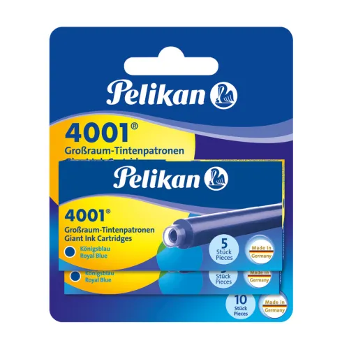 Großraum-Tintenpatronen für alle Pelikan- und viele andere Patronen-Füller. Königsblaue Tinte ist löschbar und auswaschbar. Blisterverpackung enthält 2 x 5er Set Tintenpatronen. Qualität Made in Germany.