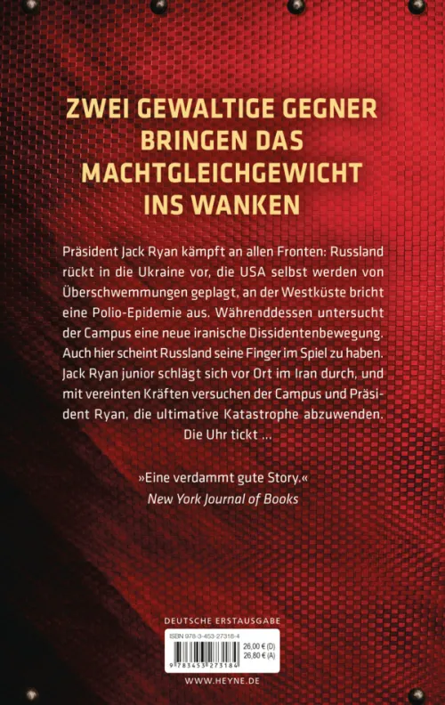 Präsident Jack Ryan kämpft an allen Fronten: Während es innenpolitisch in den USA hoch hergeht, rückt in Osteuropa Russland in die Ukraine vor. Dann gelangen zwei russische Atomraketen in den Iran. Hängt beides miteinander zusammen? Und was hat die neue iranische Rebellenbewegung damit zu tun? Die gibt sich zwar zunächst als Verbündeter aus, macht sich jedoch schnell höchstverdächtig. Langsam entwirren sich die Fäden eines perfiden Komplotts: Die globale digitale Kommunikation soll durch einen massiven Anschlag zerstört werden. Mit vereinten Kräften versuchen der Campus und Präsident Ryan die ultimative Katastrophe abzuwenden. Und die Uhr tickt . . .