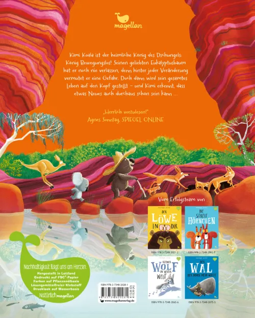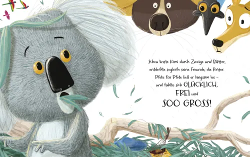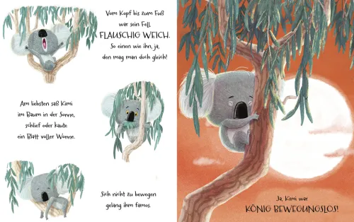 Kimi Koala ist der heimliche König des Dschungels: König Bewegungslos! Denn seinen geliebten Eukalyptusbaum hat er noch nie verlassen, denn hinter jeder Veränderung vermutet er eine Gefahr. Doch dann wird sein gesamtes Leben auf den Kopf gestellt und Kimi erkennt, dass etwas Neues auch durchaus schön sein kann