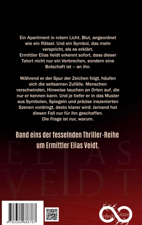 Ein Apartment in rotem Licht. Blut, angeordnet wie ein Rätsel. Und ein Symbol, das mehr verspricht, als es erklärt. Ermittler Elias Veidt erkennt sofort, dass dieser Tatort nicht nur ein Verbrechen, sondern eine Botschaft ist – an ihn. Während er der Spur der Zeichen folgt, häufen sich die seltsamen Zufälle. Menschen verschwinden, Hinweise tauchen an Orten auf, die nur er kennen kann. Und je tiefer er in das Muster aus Symbolen, Spiegeln und präzise inszenierten Szenen vordringt, desto klarer wird: Jemand hat diesen Fall nur für ihn geschaffen. Die Frage ist nur, warum. Band eins der fesselnden Thriller-Reihe um Ermittler Elias Veidt.