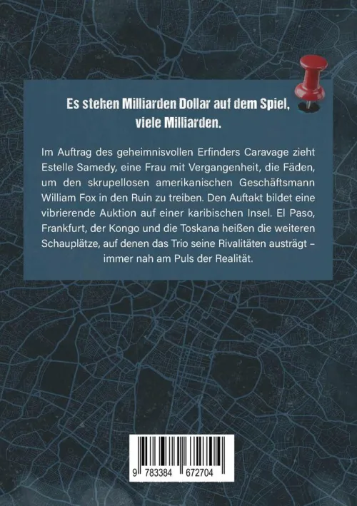 Im Auftrag des geheimnisvollen Erfinders Caravage zieht Estelle Samedy, eine Frau mit Vergangenheit, die Fäden, um den skrupellosen amerikanischen Geschäftsmann William Fox in den Ruin zu treiben. Der Grund ist ein Verrat. Den Auftakt bildet eine Auktion auf einer karibischen Insel. Fox möchte 40 Milliarden Dollar erlösen, um seinen Wunschtraum zu erfüllen, Eigner des größten Getränkekonzerns der Welt zu werden. Estelle Samedy hat jedoch etwas dagegen. Es entwickelt sich ein Rachefeldzug. Fox will sein Ziel um jeden Preis erreichen. Estelle Samedy und Caravage wollen ihn ruinieren. Die Protagonisten tragen ihre Rivalitäten auf verschiedenen Schauplätzen aus: Im Kongo, zu dem Fox eine besondere Beziehung hat, in El Paso, in Frankfurt und in der Toskana. Dabei spielt die Erfindung eines unglaublichen Medikaments, das den Bierkonsum stoppen soll, eine Rolle und führt zu unerwarteten Turbulenzen. Die verblüffenden Geheimnisse von Caravage, Einblicke in die brutalen Geschäftsmethoden von Fox, das souveräne Handeln von Estelle Samedy und ihr Gefühlsleben – Spannung garantiert.