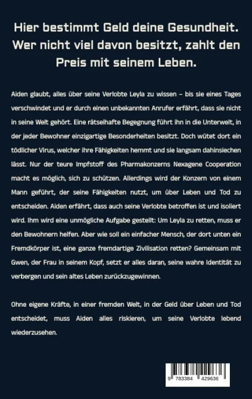 Hier bestimmt Geld deine Gesundheit. Wer nicht viel davon besitzt, zahlt den Preis mit seinem Leben. Aiden glaubt, alles über seine Verlobte Leyla zu wissen – bis sie eines Tages verschwindet und er durch einen unbekannten Anrufer erfährt, dass sie nicht in seine Welt gehört. Eine rätselhafte Begegnung führt ihn in die Unterwelt, in der jeder Bewohner einzigartige Besonderheiten besitzt. Doch wütet dort ein tödlicher Virus, welcher ihre Fähigkeiten hemmt und sie langsam dahinsiechen lässt. Nur der teure Impfstoff des Pharmakonzerns Nexagene Cooperation macht es möglich, sich zu schützen. Allerdings wird der Konzern von einem Mann geführt, der seine Fähigkeiten nutzt, um über Leben und Tod zu entscheiden. Aiden erfährt, dass auch seine Verlobte betroffen ist und isoliert wird. Ihm wird eine unmögliche Aufgabe gestellt: Um Leyla zu retten, muss er den Bewohnern helfen. Aber wie soll ein einfacher Mensch, der dort unten ein Fremdkörper ist, eine ganze fremdartige Zivilisation retten? Gemeinsam mit Gwen, der Frau in seinem Kopf, setzt er alles daran, seine wahre Identität zu verbergen und sein altes Leben zurückzugewinnen. Ohne eigene Kräfte, in einer fremden Welt, in der Geld über Leben und Tod entscheidet, muss Aiden alles riskieren, um seine Verlobte lebend wiederzusehen.