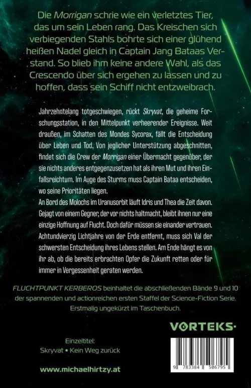 Die Morrigan schrie wie ein verletztes Tier, das um sein Leben rang. Das Kreischen sich verbiegenden Stahls bohrte sich einer glühend heißen Nadel gleich in Captain Jang Bataas Verstand. So blieb ihm keine andere Wahl, als das Crescendo über sich ergehen zu lassen und zu hoffen, dass sein Schiff nicht entzweibrach. Jahrzehntelang totgeschwiegen, rückt Skryvat, die geheime Forschungsstation, in den Mittelpunkt verheerender Ereignisse. Weit draußen, im Schatten des Mondes Sycorax, fällt die Entscheidung über Leben und Tod. Von jeglicher Unterstützung abgeschnitten, findet sich die Crew der Morrigan einer Übermacht gegenüber, der sie nichts anderes entgegenzusetzen hat als ihren Mut und ihren Einfallsreichtum. Im Auge des Sturms muss Captain Bataa entscheiden, wo seine Prioritäten liegen. An Bord des Molochs im Uranusorbit läuft Idris und Thea die Zeit davon. Gejagt von einem Gegner, der vor nichts haltmacht, bleibt ihnen nur eine einzige Hoffnung auf Flucht. Doch dafür müssen sie einander vertrauen. Achtundvierzig Lichtjahre von der Erde entfernt, muss sich Val der schwersten Entscheidung ihres Lebens stellen. Am Ende hängt es von ihr ab, ob die bereits erbrachten Opfer die Zukunft retten oder für immer in Vergessenheit geraten werden. FLUCHTPUNKT SYCORAX beinhaltet die abschließenden Bände 9 und 10 der spannenden, actionreichen und mysteriösen Science-Fiction Serie. Erstmalig ungekürzt im Taschenbuch. Einzeltitel:SkryvatKein Weg zurück