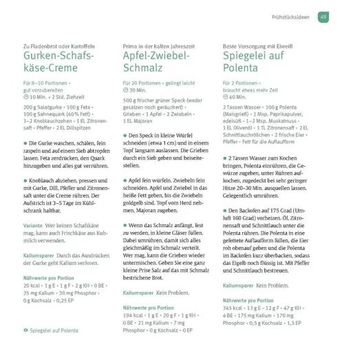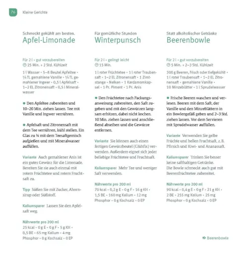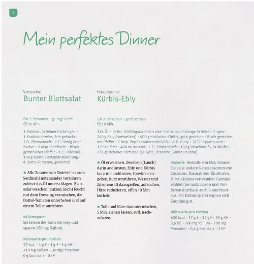 – Die wichtigen Nährwerte: jedes Rezept mit den Nährwertangaben, auf die es bei einer Niereninsuffizienz besonders ankommt.