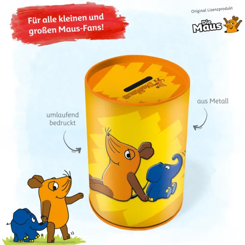 Damit aus einem kleinen Münzschatz mal ein großer wird, der Wünsche erfüllen kann, passt die Maus drauf auf! Dank abnehmbarem Deckel ist die hübsche Metall-Spardose beliebig oft wiederverwendbar. Ein tolles Geschenk, um Kinder den Wert von Geld selbst erfahren zu lassen – und ein Muss für kleine Maus-Fans!