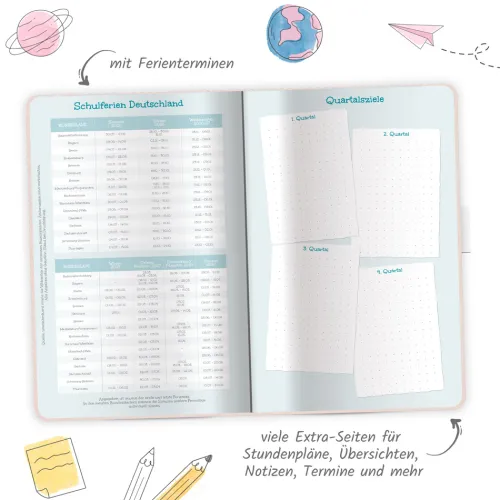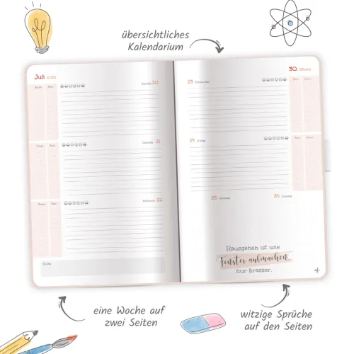 Dieser Schülerkalender für 2026/27 besitzt einen flexiblen und zugleich stabilen Einband mit Glanz-Effekt. Er ist ca. 13 x 20 cm groß und bietet auf 128 Seiten genügend Platz für wichtige Notizen und Termine. Für Stundenpläne, Noten, Schulferien, Adressen, Geburtstage usw. gibt es Extra-Seiten. Durch die seitlich angebrachte Gummischlaufe ist dein Lieblingsstift immer griffbereit und die Innentasche des Planers bietet ausreichend Platz für deine Notizzettel. Mit einem Gummiband kann der Timer verschlossen werden, so dass er nicht ungewollt aufblättern kann.