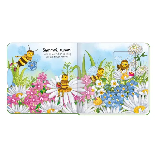 Schau, wer sich hier versteckt! Bewege die Schieber und entdecke die kleinen Bewohner der Wiese bei ihren Abenteuern! Mit tollen Glanzeffekten auf dem Cover und allen Innenseiten.