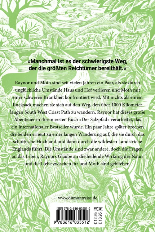 RAYNOR UND MOTH sind seit vielen Jahren ein Paar, als sie durch unglückliche Umstände Haus und Hof verlieren und Moth mit einer schweren Krankheit konfrontiert wird. Mit nichts als einem Rucksack machen sie sich auf den Weg, den über 1000 Kilometer langen South West Coast Path zu wandern. Raynor hat dieses große Abenteuer in ihrem ersten Buch „Der Salzpfad“ verarbeitet, das ein internationaler Bestseller wurde. Ein paar Jahre später brechen die beiden erneut zu einer langen Wanderung auf, die sie durch das schottische Hochland und dann durch die wildesten Landstriche Englands führt. Die Umstände sind zwar andere, doch die Fragen an das Leben, Raynors Glaube an die heilende Wirkung der Natur und die Liebe zwischen ihr und Moth sind geblieben.