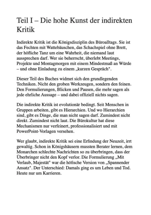 Ob im Meeting, per E-Mail oder beim Kaffeeautomaten mit diesen von der Personalabteilung abgesegneten Phrasen navigierst du sicher durch das Minenfeld der Bürokommunikation. Du lernst, wie du Feedback gibst, das höflich klingt, aber messerscharf sitzt. Wie du Ideen zerpflückst, ohne unhöflich zu wirken. Und wie du die dümmsten Vorschläge elegant ausbremst, bevor sie zur Realität werden.