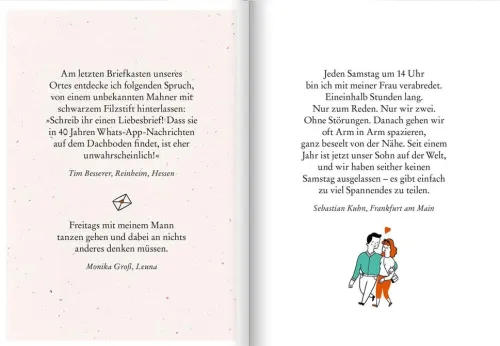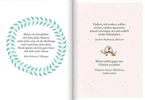In der Rubrik »Was mein Leben reicher macht« beschreiben jede Woche Leser*innen der ZEIT Glücksmomente aus ihrem Alltag. In diesem Geschenkbuch sind erstmals die schönsten Beiträge über das schönste Gefühl der Welt versammelt, von der flüchtig notierten Liebesbekundung über ein wertschätzendes „Dankeschön“ in hektischen Alltagsmomenten bis zur ganz bewusst genossenen Zweisamkeit. Die wahren Geschichten lassen uns an bewegenden, rührenden, heiteren und romantischen Momenten zwischen zwei Menschen teilhaben: „Mitten im Einschlafen ‚Ich liebe dich‘ flüstern, nicht sicher sein, ob du überhaupt noch wach bist, dann deine Hand spüren und ein ganz leises ‚Ich dich auch‘ hören“ ist nur einer der kleinen Liebesglücksmomente aus dem Alltag einer Leserin. So wird das liebevoll gestaltete und bunt illustrierte Buch zu einem ganz besonderen Geschenk für Menschen, die wir lieben – zum Valentinstag, zur Hochzeit, zum Jahrestag oder auch als kleine Aufmerksamkeit zwischendurch.