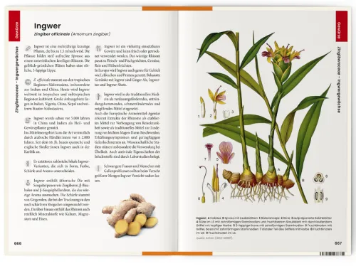 Inhalt: – ca. 350 Pflanzen; pro Pflanze 2-4 Seiten- Großformatige Illustrationen/Abbildungen mit Legende (wissenschaftlicherName, Pflanzenfamilie, deutsche Pflanzennamen, Handelsnamen, Beschreibung der Vorkommen und Anbaugebiete)- Genaue Bezeichnung der genutzten Organe (Blätter, Früchte, Samen, Knollen etc.)- Ausführlicher Text zu interessanten Aspekten wie Nutzung, Kultivierung, wirtschaftlicher Bedeutung, Anbau, Giftigkeiteinzelner Pflanzenteile etc. – 2-3 kleine Detailabbildungen zu den als Nahrungsmitteln genutztenOrganen, Sorten etc. – Mit Aussicht des Einflusses der klimatischen Veränderungenauf die jeweiligen PflanzenAufteilung: ca. 100 Obstsorten, 105 Gewürze, 90 Gemüse, 50 Sättigungsbeilagen. Weiterhin: Ölliefernde Pflanzen, Algen, Pilze, Genussmittel und Drogen, Hülsenfrüchte etc.