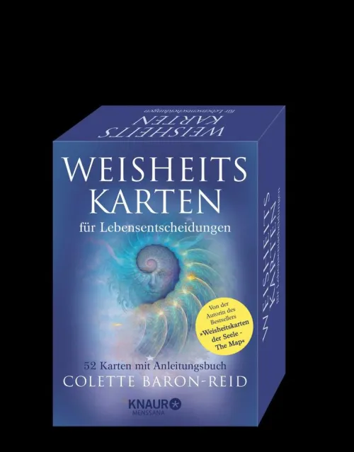 Colette Baron-Reid, die Autorin des Bestsellers „Weisheitskarten der Seele – The Map“ hat einen neuen magischen Wegweiser geschrieben, die „Weisheitskarten für Lebensentscheidungen“. Ob es sich um Liebe, Erfolg, Sinnsuche oder inneren Frieden handelt: Die 52 Karten und das Anleitungsbuch helfen, alle Aspekte des eigenen Lebens zu beleuchten und die richtigen Entscheidungen zu treffen. Symbolik von Tieren, Elemente der Natur und andere kraftvolle Sinnbilder auf diesen Weisheitskarten ermöglichen eine intensive Auseinandersetzung mit den eigenen Fragestellungen.
