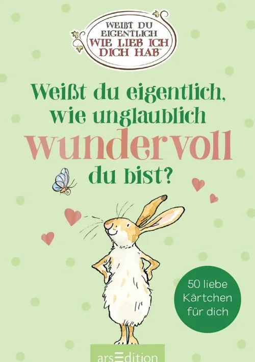 Der weltbekannte Kinderbuchklassiker Weißt du eigentlich, wie lieb ich dich hab? hat Millionen von Menschen verzaubert. Geschrieben von Sam McBratney und liebevoll illustriert von Anita Jeram vermittelt die Geschichte des kleinen und des großen Hasen Werte wie Zusammengehörigkeit, Liebe und Geborgenheit. Diese Kartenbox ist ein tolles Geschenk für alle Herzensmenschen. Ob für den liebsten Schatz, die beste Freundin oder die Mama diese Kartenbox zaubert garantiert ein Lächeln ins Gesicht und lässt das Herz vor Freude hüpfen. Auf jeder Karte ist ein schöner Spruch, ein Zitat oder eine Botschaft, wie schön es ist, dass es den Lieblingsmenschen gibt. Kombiniert mit den zauberhaften Hasen-Illustrationen sind die Karten nicht nur ein schönes Kompliment, sondern können auch als Glücksbringer dienen. Einfach eine Karte ziehen, den Gedanken mit in den Tag nehmen und sich immer wieder daran erfreuen!