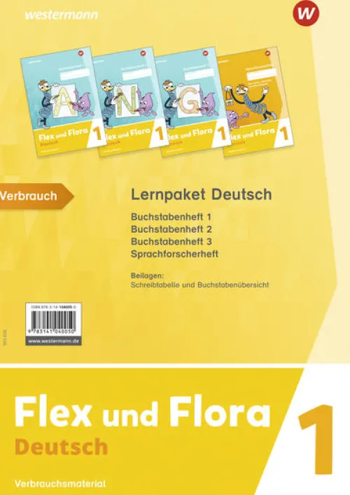 Das Flex und Flora Lernpaket Deutsch 1 enthält die Buchstabenhefte 1, 2 und 3, das Sprachforscherheft und zwei Beilagen (Schreibtabelle und Buchstabenübersicht).
