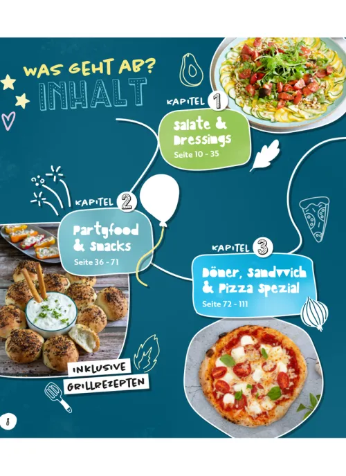Unterteilt ist das Ganze in 7 Kapitel: Salate & Dressings, Partyfood & Snacks, Döner & Pizza Spezial,