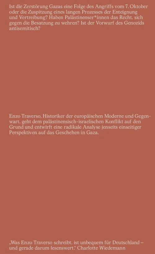 Enzo Traverso, Historiker der europäischen Moderne und Gegenwart, geht dem palästinensisch-israelischen Konflikt auf den Grund und entwirft eine radikale Analyse jenseits einseitiger Perspektiven auf das Geschehen in Gaza.